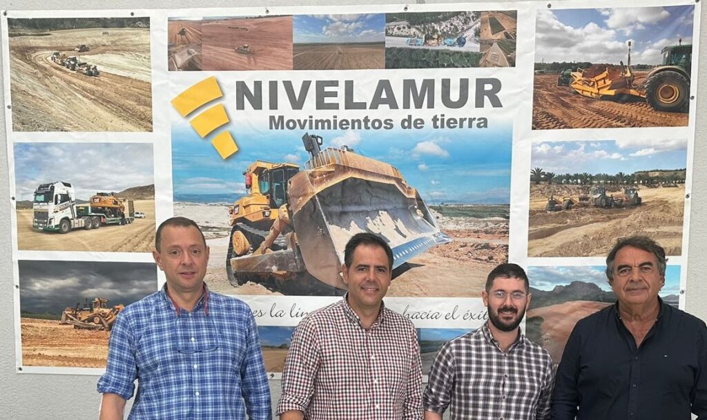 En la foto se abrazan los dos directores de las compañías, arropados por los ingenieros del Grupo Ingesagua-Riegos de Levante. Una inversión millonaria que llevará a un mejor desempeño y rapidez en los movimientos de tierra de construcción de balsas de riego.