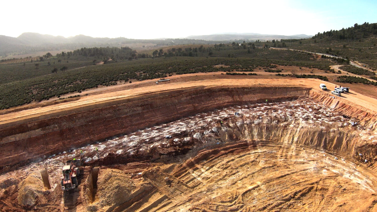 En el fondo de la balsa de la SAT Derramadero Campillo en Elche de la Sierra nos encontramos con el problema de un duro fondo de piedra, tras los trabajos de preparación para colocación de los explosivos en una multitud de pequeñas perforaciones asistimos a la voladura de toda esa dura piedra que queda reducida a añicos fácilmente extraíbles.