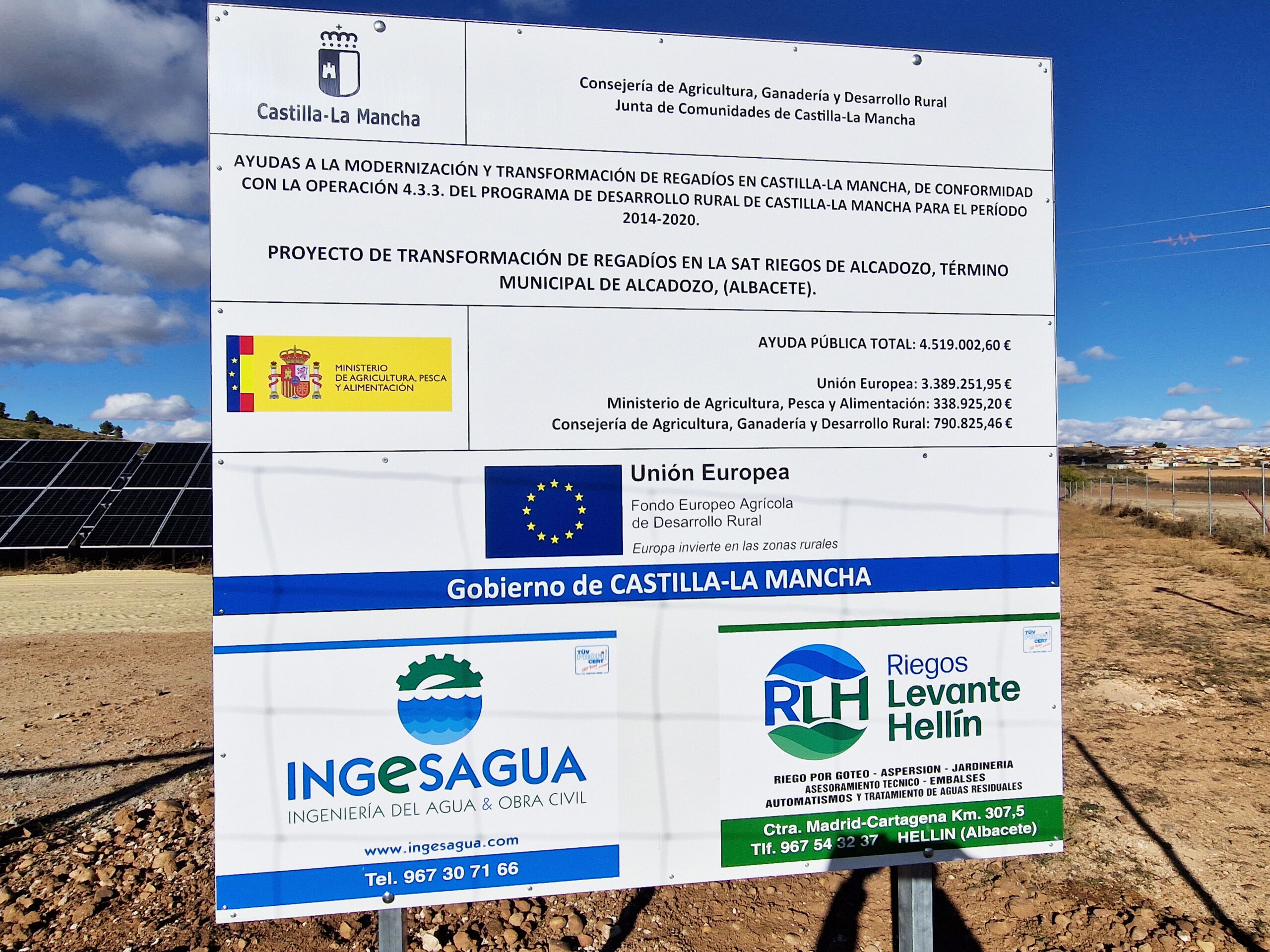Gran modernización de regadíos que incluye una gran balsa de 199.000 m3 para la que fue necesaria la voladura del lecho rocoso y que dará servicio a 670 Ha de cultivos leñosos y de hortalizas. El proyecto incluye también un sondeo con bombeo solar, estaciones de rebombeo, más toda la red de tuberías, valvulería e hidrantes; incluyendo un enorme equipo de filtrado por anillas. Todo ello contribuirá a mejorar la rentabilidad agraria y a recuperar la población de la zona.